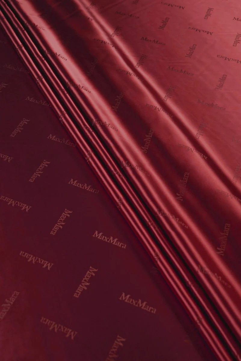 Italienisches Viskosefutter in Himbeerrot mit Satinbindung. Stoff signiert mit dem Namen eines bekannten Modehauses - unelastisch, glänzend, dicker. Perfekt zum Füttern von Mänteln, Jacken, Westen, Jacken.