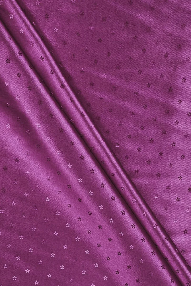 Italienisches Jacquardfutter in dunklem Fuchsia mit einem Motiv aus regelmäßigen, kleinen Blumen. Die Größe einer Blüte beträgt 5 mm. Unelastischer Stoff, leicht glänzend. Ideal zum Futter von Mänteln, Jacken, Westen, Jacken.