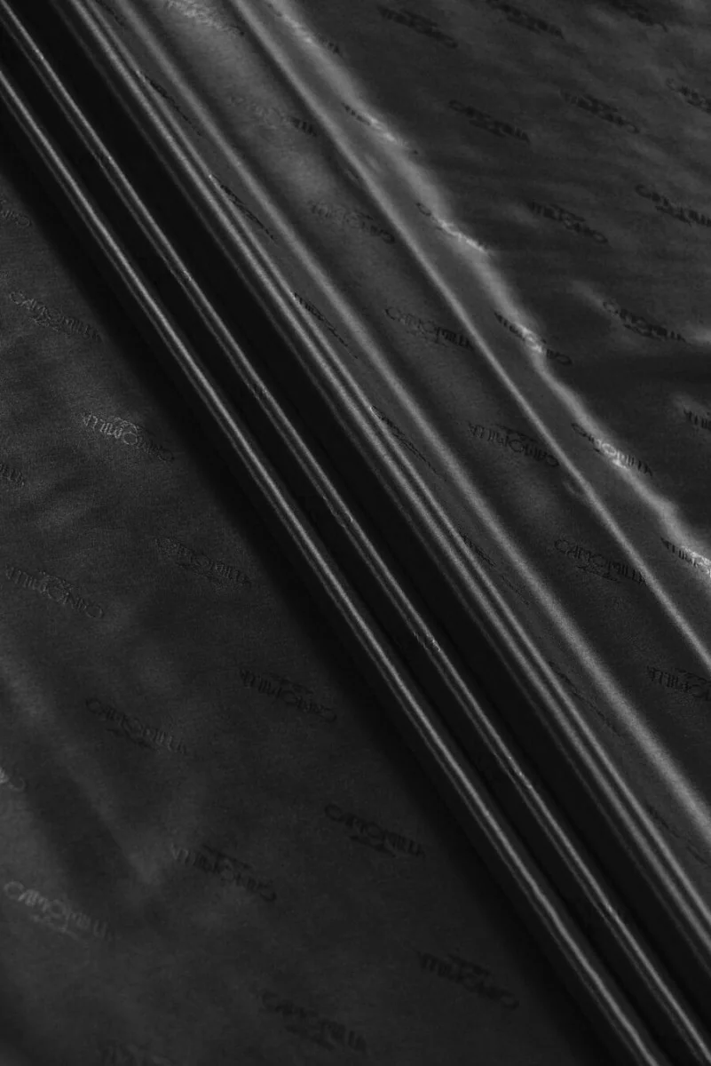 Italienisches Innenfutter in Schwarz. Signiert mit dem Namen des bekannten Modehauses. Unelastischer Stoff, leicht glänzend. Ideal zum Futter von Mänteln, Jacken, Westen, Jacken.