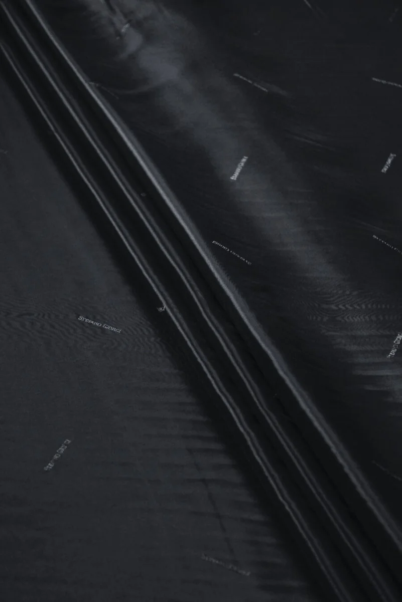 Italienisches Viskosefutter in Schwarz. Signiert mit dem Namen eines bekannten Modedesigners. Unelastischer Stoff, leicht glänzend. Ideal zum Futter von Mänteln, Jacken, Westen, Jacken.