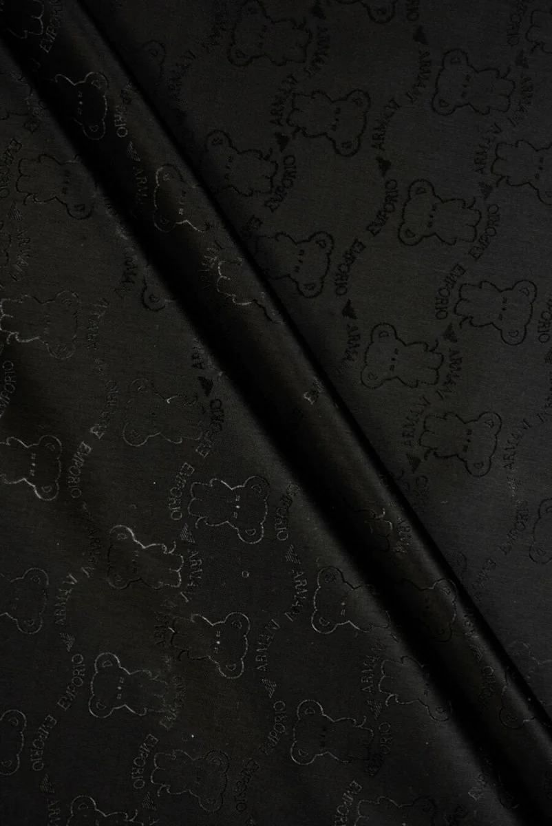 Italienisches Jacquardfutter in Schwarz mit Teddybär-Motiv, signiert mit dem Namen des bekannten italienischen Modehauses. Unelastischer Stoff, leicht glänzend. Ideal zum Futter von Mänteln, Jacken, Westen, Jacken.