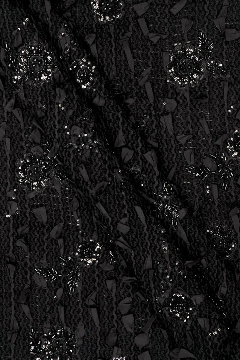 Italienischer, exklusiver Stoff, der an schwarze Bucles im Gewebe erinnert. Der Stoff hat dicht gewebte schwarze Bänder, die 2,5 cm überstehen, und gestickte schwarze Blumen, die dicht mit schwarzen Pailletten und Perlen verziert sind. Der Stoff ist unelastisch, locker gewebt, weich drapiert, mit einer klaren Struktur. Ein interessantes Angebot, aus dem Sie Kleider, Röcke sowie elegante Oberbekleidung wie Umhänge und Strickjacken kreieren können.