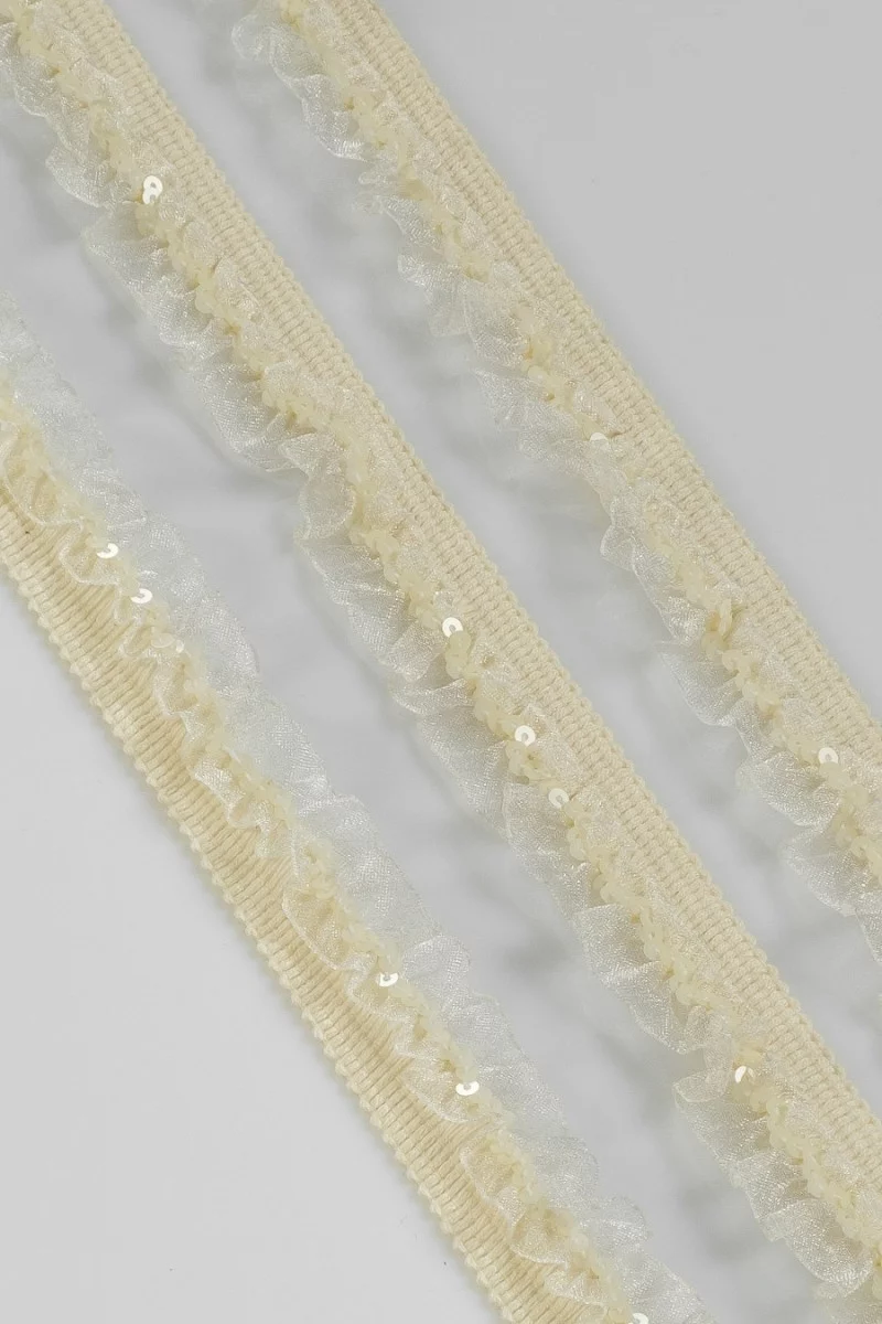 Italienisches Kurzwarenband in Ecru-Farbe. Ein Organza-Rüschen und kleine Pailletten wurden an das Gummiband genäht.