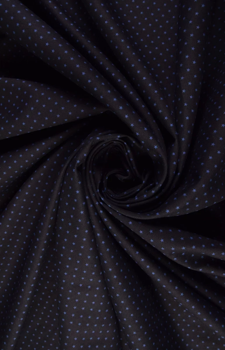 Hemd aus Baumwolle mit sehr kleinen, blauen Sternen auf schwarzem Grund. Wir empfehlen es zum Nähen von Sommerhemden, Blusen, Kleidern oder Röcken.