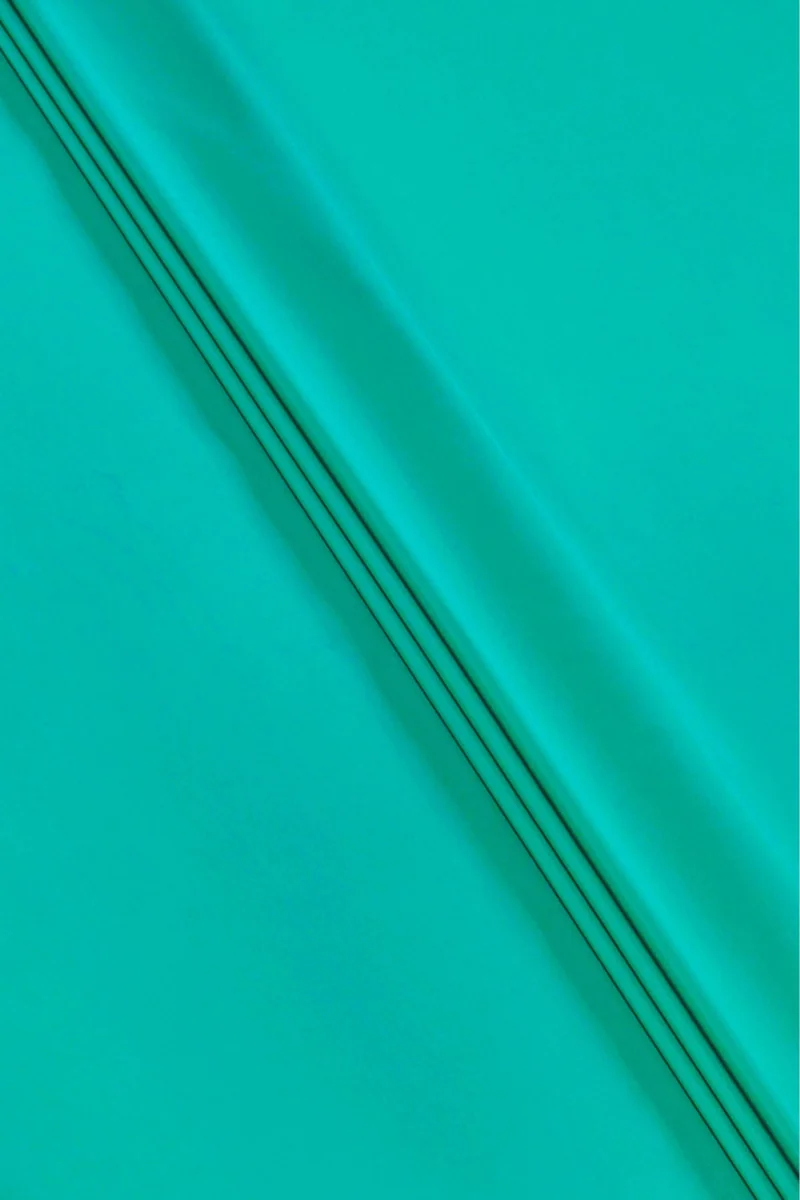Italienischer Baumwollstoff mit Zusatz von Elasthan in Türkisgrün. Ein elastischer Stoff mit mittlerer Dicke und glatter, matter Webart, der zum Nähen eines Kleides, eines Rocks oder einer Hose bestimmt ist. Natürlicher Stoff von sehr guter Qualität, der Zusatz von Elasthan macht ihn angenehmer zu verwenden und knittert weniger. Ein unersetzlicher Stoff im Frühling und Sommer.