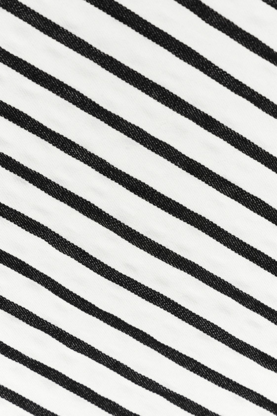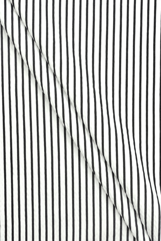 Italienischer Baumwollstoff mit Zusatz von Polyester und Elasthan im angesagtesten Streifenmuster dieser Saison. Das Muster ist vertikal in weiß und schwarz angeordnet, die Streifen sind 0,4 und 0,8 cm breit. Der Stoff ist leicht elastisch mit mittlerer Dicke und einem sehr interessanten, gewellten (gefalteten) Gewebe, das zum Nähen eines Kleides, eines Rocks, eines Hemdes oder einer weiten Hose bestimmt ist. Natürlicher Stoff von sehr guter Qualität, der Zusatz von Polyester und Elasthan macht ihn angenehmer zu tragen und knittert weniger. Ein unersetzlicher Stoff im Frühling und Sommer.