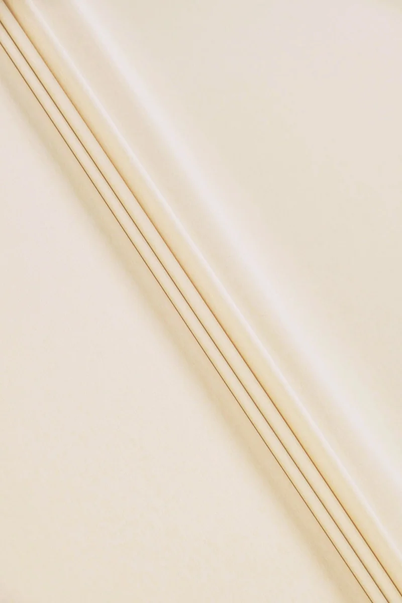 Italienischer Baumwollstoff mit Zusatz von Elasthan in hellbeiger Farbe. Ein elastischer Stoff mit mittlerer Dicke und matter Webart, der zum Nähen eines Kleides, eines Rocks oder einer Hose bestimmt ist. Natürlicher Stoff von sehr guter Qualität, der Zusatz von Elasthan macht ihn angenehmer zu verwenden und knittert weniger. Ein unersetzlicher Stoff im Frühling und Sommer.