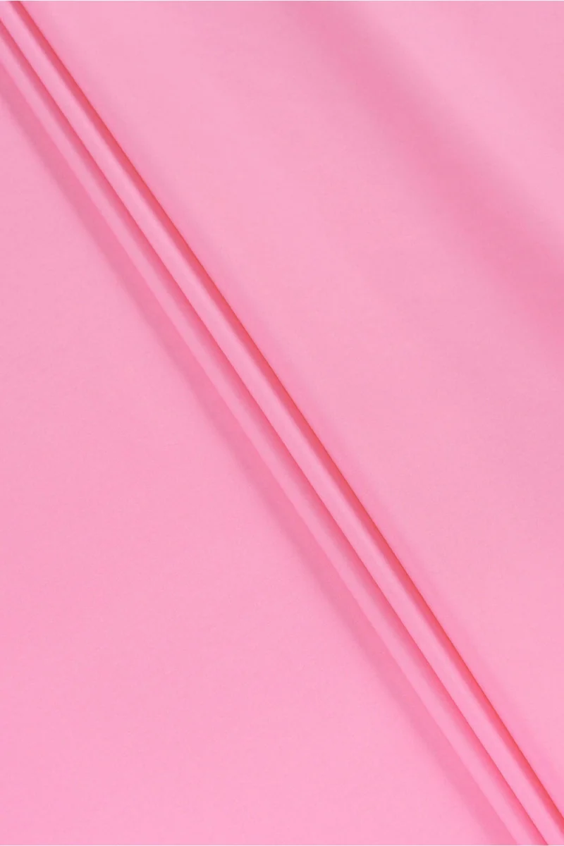 Italienisches Hemd aus Baumwolle, Gummizug in Rosa. Ein dünner, aber blickdichter Stoff mit mattem Gewebe, der zum Nähen eines Hemdes, einer Bluse oder eines Kleides bestimmt ist. Natürlicher Stoff von sehr guter Qualität, der Zusatz von Elasthan macht ihn angenehmer zu verwenden und knittert weniger. Ein unersetzlicher Stoff im Frühling und Sommer.