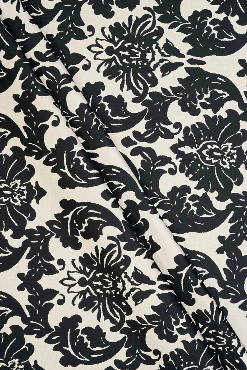 Italienischer Baumwollstoff mit Zusatz von Elasthan mit einem Motiv aus schwarzen, dicht platzierten Ornamenten auf kaltbeigem Hintergrund. Der Stoff kommt in 115 cm langen Coupons, jeder coupon ist mit einer 21,5 cm breiten Bordüre versehen und besteht aus drei Streifen - ein Streifen stellt ein farblich invertiertes Leitmotiv dar und ist 10 cm breit, der andere Gürtel ist schwarz und ebenfalls 10 cm lang, dazwischen geht 1,5 cm beige. Der Stoff ist blickdicht, weich, elastisch und mit einem dezenten Glanz veredelt. Es eignet sich perfekt zum Nähen eines Kleides, eines Rocks, einer Hose und einer Shorts.