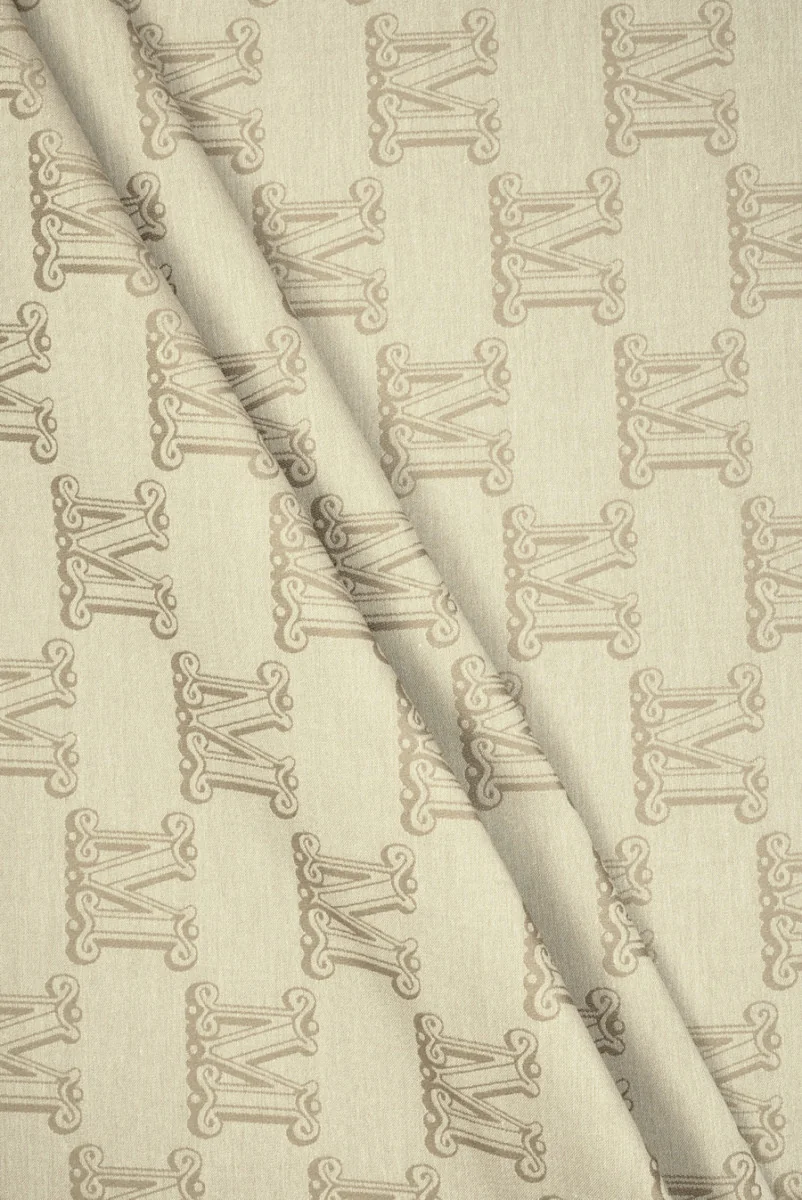 Italienischer Stoff 100% Baumwolle in Beige mit einem Motiv aus sich wiederholenden Buchstaben M. Regelmäßige Muster sind in Linien im Abstand von 6,5 cm gelegt, haben eine Abmessung von 5 cm * 6 cm und bestehen aus Garn in einer dunkleren beigen Farbe als der Hintergrund. Der Stoff ist dick und steif, unelastisch und matt. Darüber hinaus stammt es aus der Kollektion eines bekannten Modehauses. Ein großartiges Angebot für Leute, die nach signierten Materialien suchen. Aufgrund der Steifigkeit des Stoffes empfehlen wir ihn für Katanas, Übergangsmäntel sowie Handtaschen.