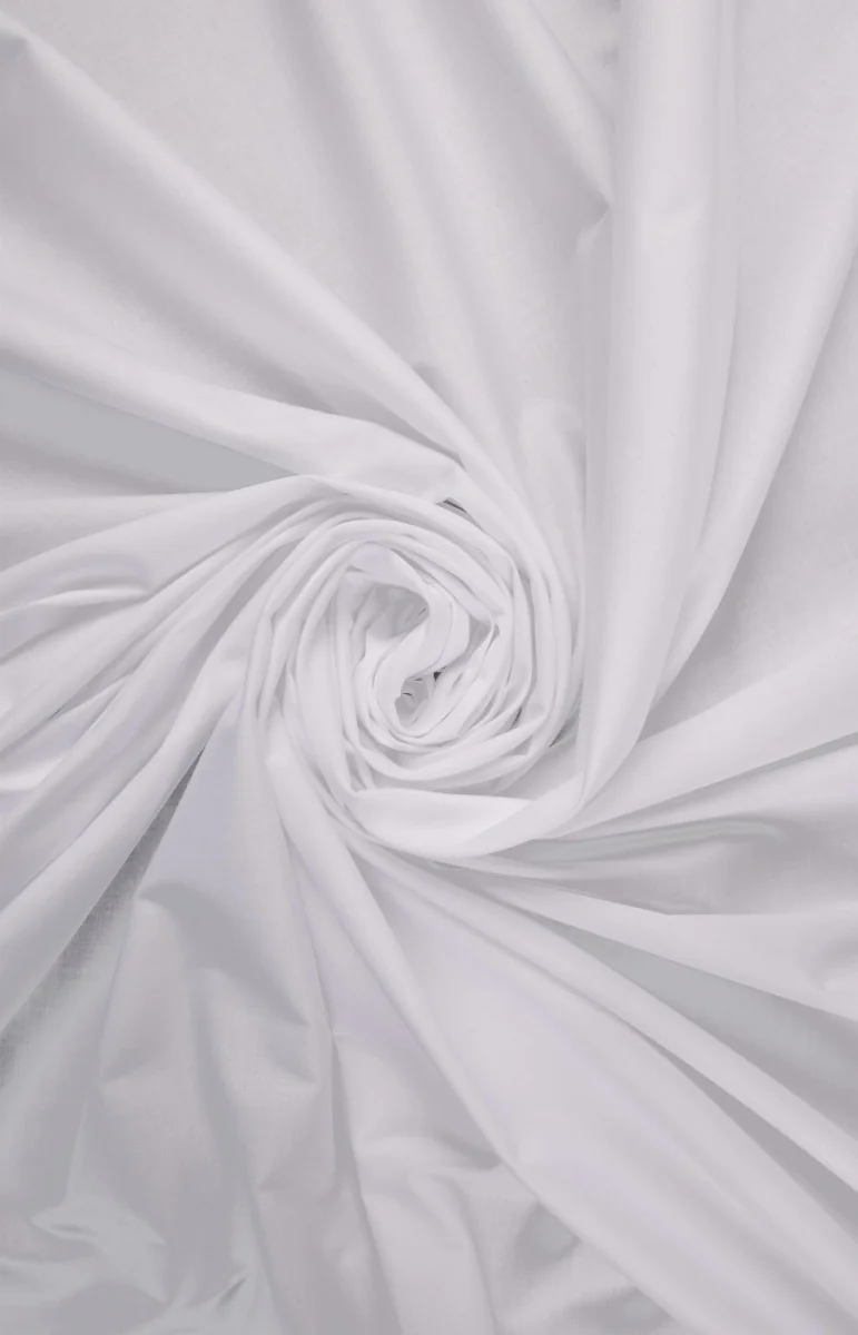 Klassisches Hemd aus weißer Baumwolle mit glatter Webart, dünn, elastisch. Die Breite des Stoffes beträgt 130 cm.