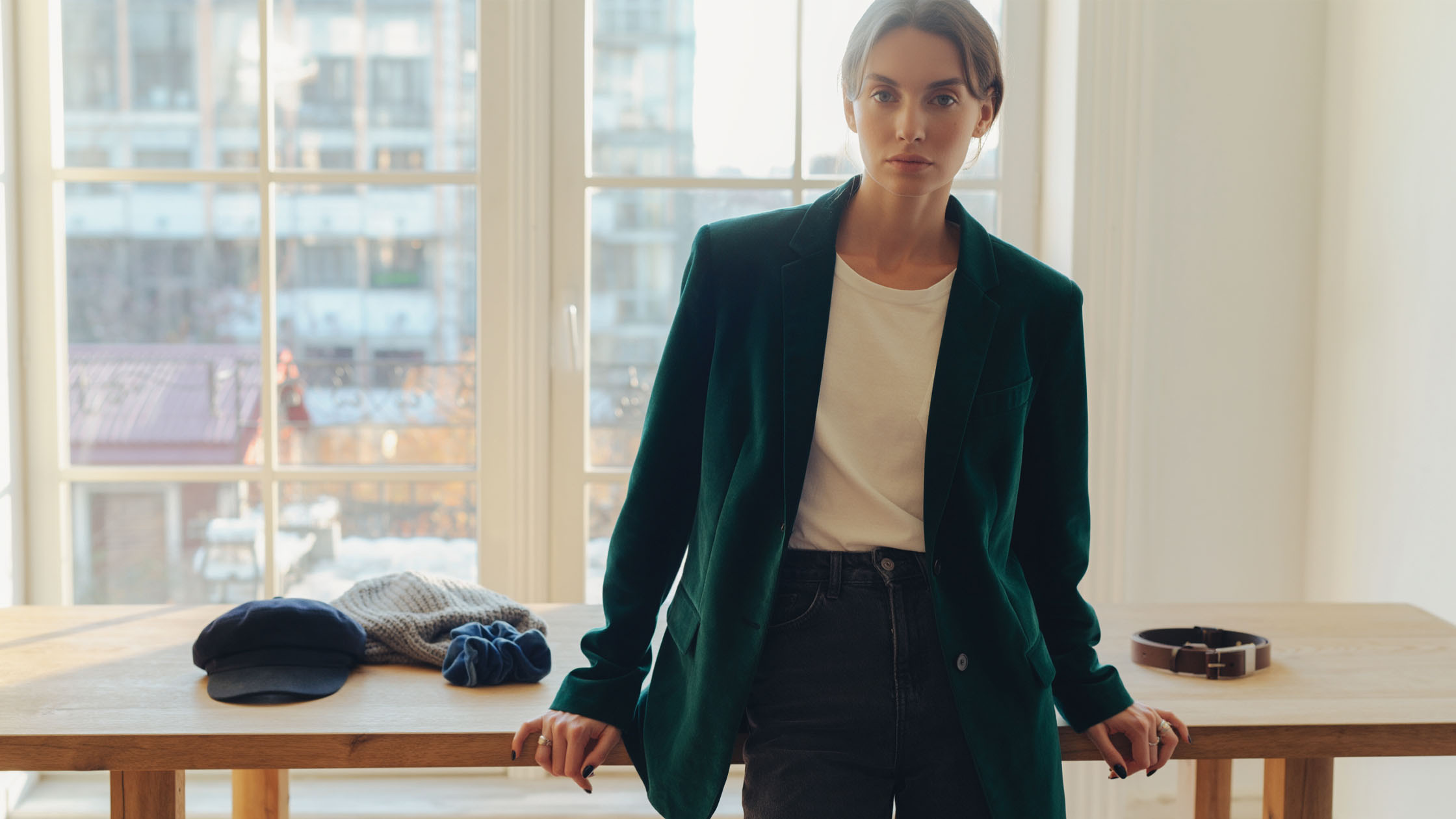 Die moderne Mode entfernt sich von stark taillierten Varianten und beschränkt die Bewegungen der Jacken zugunsten lockerer Formen, die Freiheit und Luft zwischen Körper und Stoff bieten. Wenn man eine Jacke aus Baumwollsamt näht, lohnt es sich, übergroße Schnitte mit abgesenkter Schulterlinie oder schlichte, kastige Schnitte in Betracht zu ziehen, die die Ästhetik der 80er und 90er Jahre anspielen. Ein solches Design lässt das Material in Bewegung wunderschön funktionieren, und das Licht bricht auf unauffällige Weise darauf und legt seine Qualitäten frei. Ein lockererer Schnitt ermöglicht auch das freie Schichten von Kleidung, was an kälteren Tagen unbezahlbar ist, wenn wir einen dünnen Rollkragenpullover oder einen Merinowollpullover unter der Jacke tragen möchten. Die kastige Samtjacke passt gut zu schmalen Hosen und schafft eine moderne Silhouette, die auf dem Spiel der Proportionen basiert. Durch die Wahl eines solchen Schnitts geben wir dem Stoff einen modernen Kontext und brechen damit mit seinem historischen, etwas starren Bild.