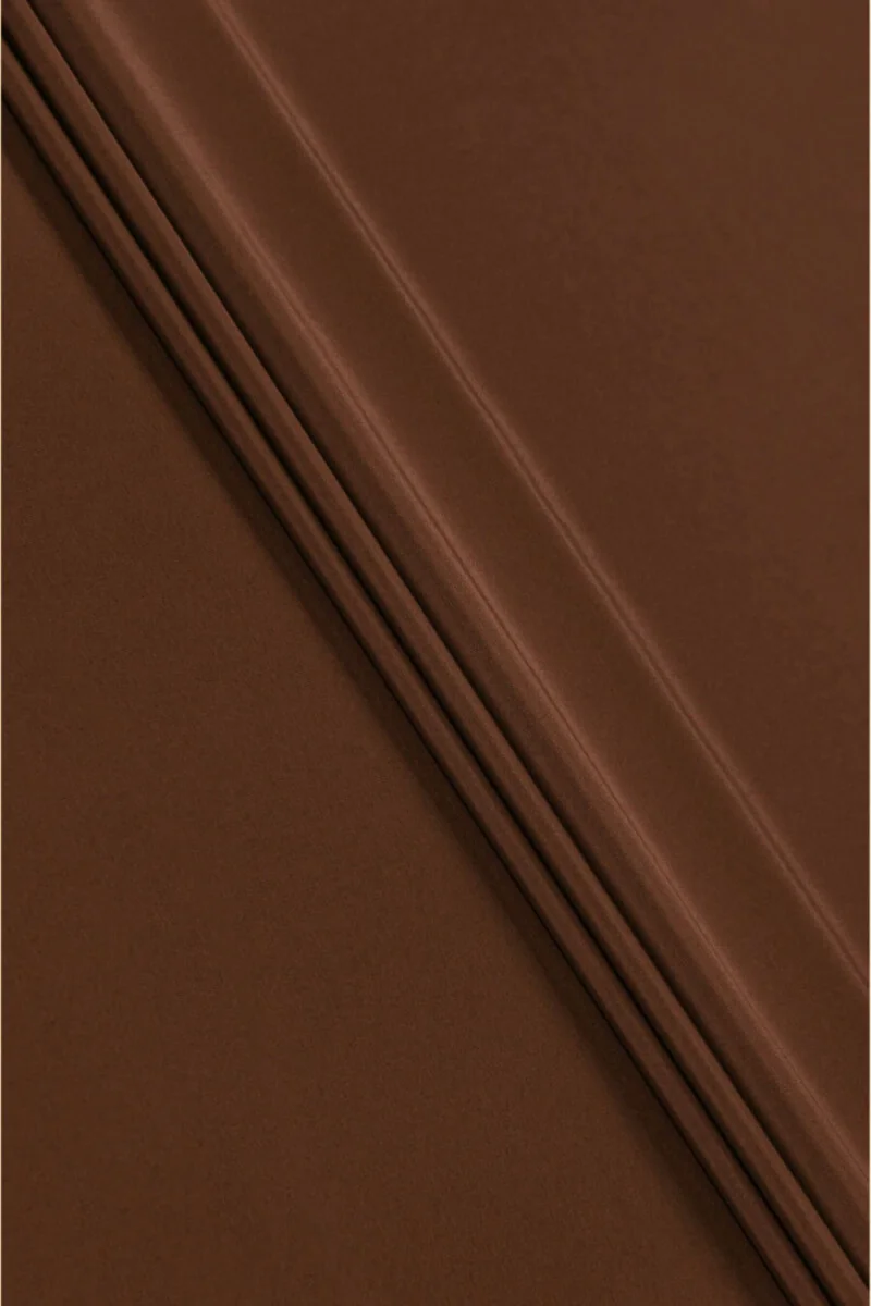 Italienischer Viskosestoff mit einer Beimischung von Cadi-Polyester in Braun. Ein unelastischer Stoff mit enger Webart, der auf der einen Seite matt und auf der anderen rutschig ist. Es eignet sich perfekt zum Nähen einer Bluse, eines Kleides oder eines Rocks.