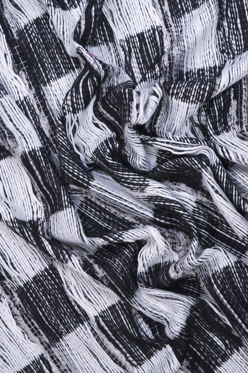 Italienischer Chanel-Kostümstoff in Schwarz mit einem Écru-Faden. Stoff mit konvexer Struktur und dichter Webart mit einem Karomotiv von +- 11 cm. Der Stoff hat lose Verflechtungen, die frei geschnitten werden können, wodurch wir den Effekt von Fransen erzielen. Dieses Verfahren ermöglicht es Ihnen, individuelle Designs nach Ihrem Geschmack zu erstellen. Ein fantastisches Angebot für Fans von Tweedkleidung in zeitlosen Farben und immer modischen Mustern, sowie für Menschen, die einzigartige Kleidung zu schätzen wissen. In diesem Stoff sind Sie nur durch Ihre Fantasie begrenzt - kreieren Sie etwas speziell für sich selbst.
