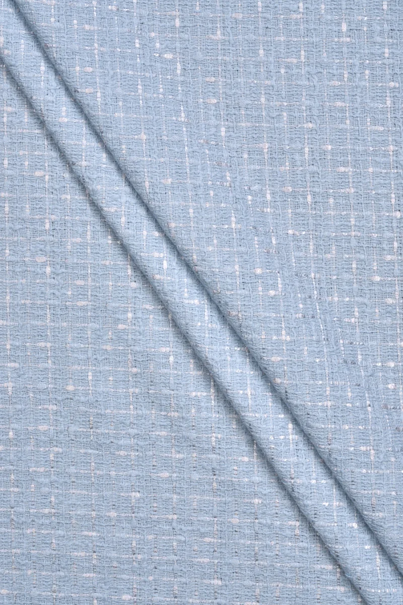 Italienischer Chanel-Kostümstoff in Himmelblau. Der Chanel-Stoff ist ein sehr eleganter, weicher und fleischiger Stoff, der für seine originelle Webart bekannt ist. Perfekt zum Nähen eines Kostüms, einer Jacke, einer Jacke, eines Rocks oder eines dünnen Mantels.