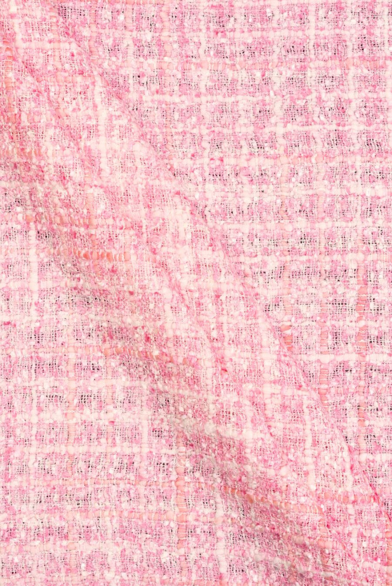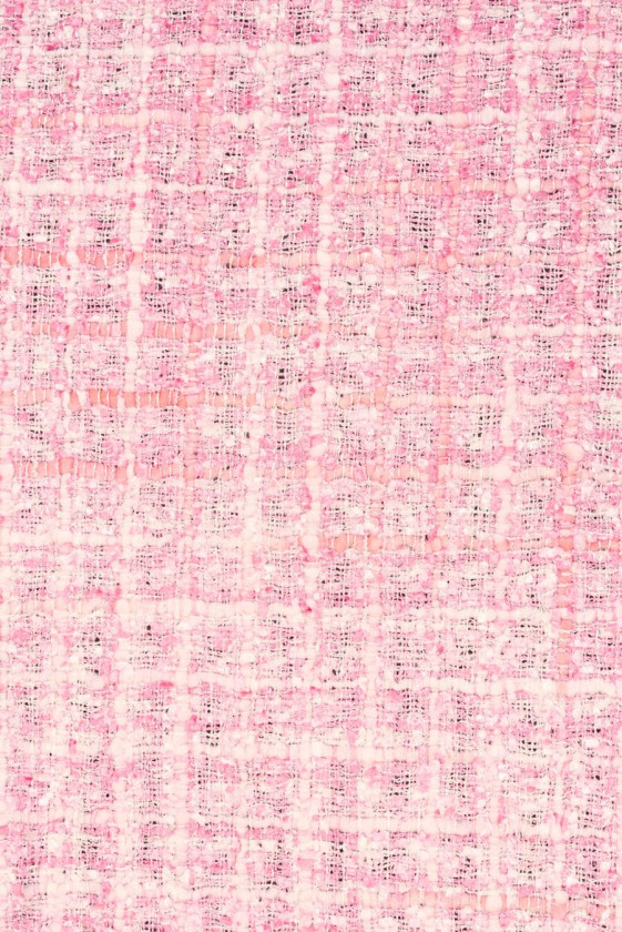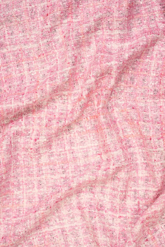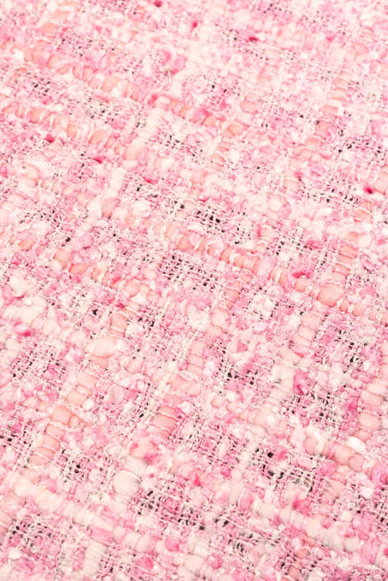 Italienischer Chanel Kostümstoff in Pink und Weiß. Ein Stoff mit einer leicht konvexen Struktur und einem lockereren Gewebe, das ein Karomuster bildet, das hauptsächlich aus Naturfasern besteht, weshalb es sehr angenehm zu tragen ist, weich, nicht elastisch. Es eignet sich perfekt zum Nähen von eleganter und alltäglicher Kleidung. Ein tolles Angebot für Liebhaber von Tweedstoffen in zeitlosen Farben.