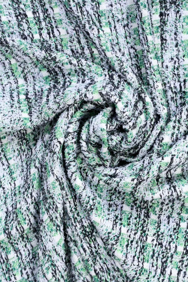 Origineller Chanel Kostümstoff in weiß, schwarz und grün kariert für elegante Sets - Jacken mit Röcken und Kleidern. Der Stoff ist mit Naturfasern, Wolle und Viskose gewebt, was für einen hohen Tragekomfort sorgt. Wir empfehlen, ein Futter zu wählen, das Sie in unserem Shop finden. Das Material ist nicht elastisch.