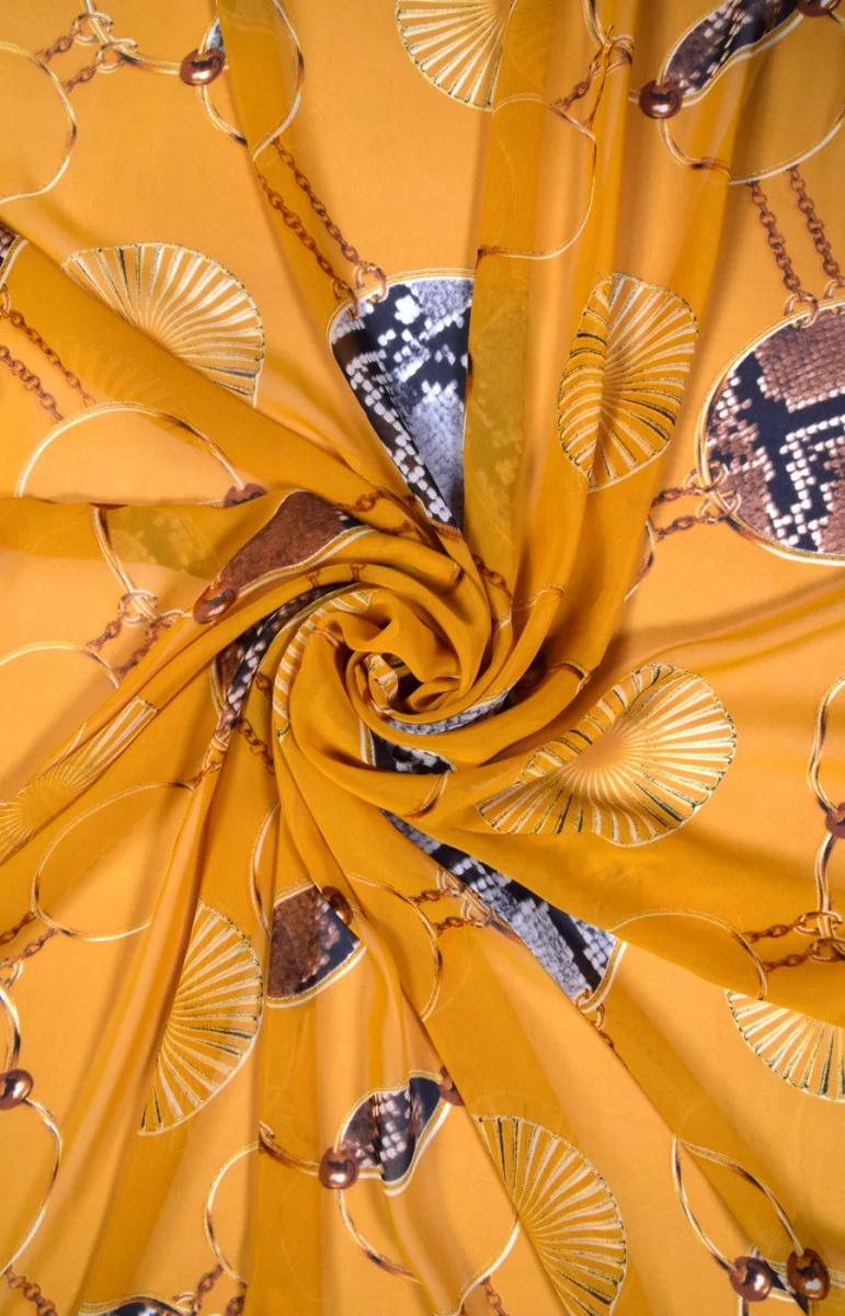 Polyester-Chiffon in einem ausgefallenen Schmuckmuster (Räder mit einem Durchmesser von 12-15 cm) ist ein sehr zarter, luftiger und transparenter Stoff. Perfekt für luftige Kleider, Blusenröcke oder Pareo. Unelastischer Stoff. Farben: auf gelb-honigfarbenem Hintergrund