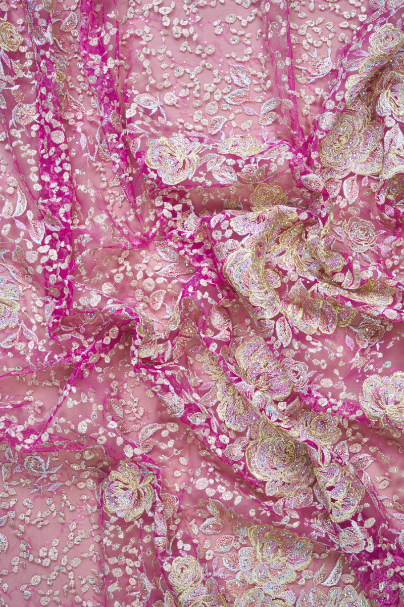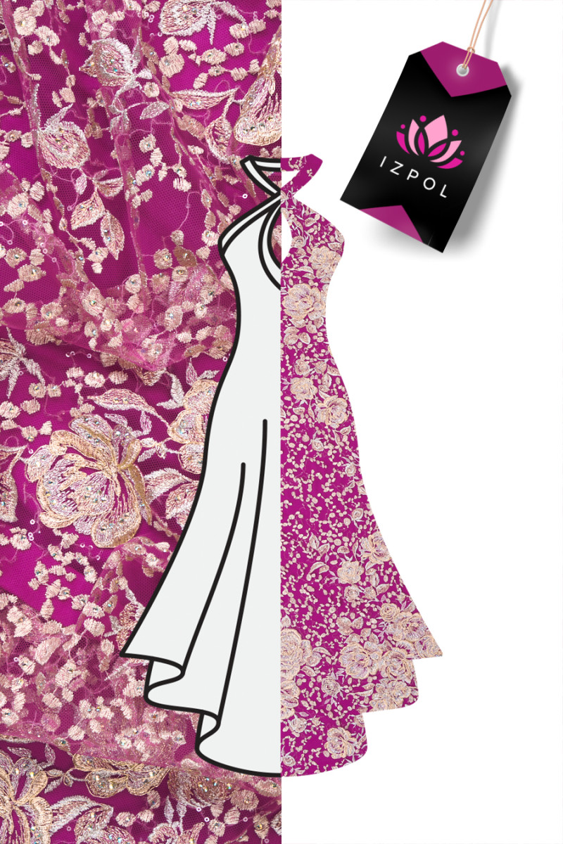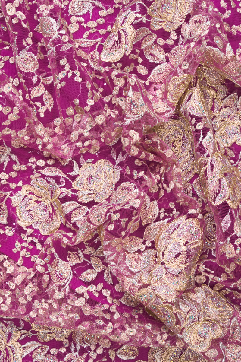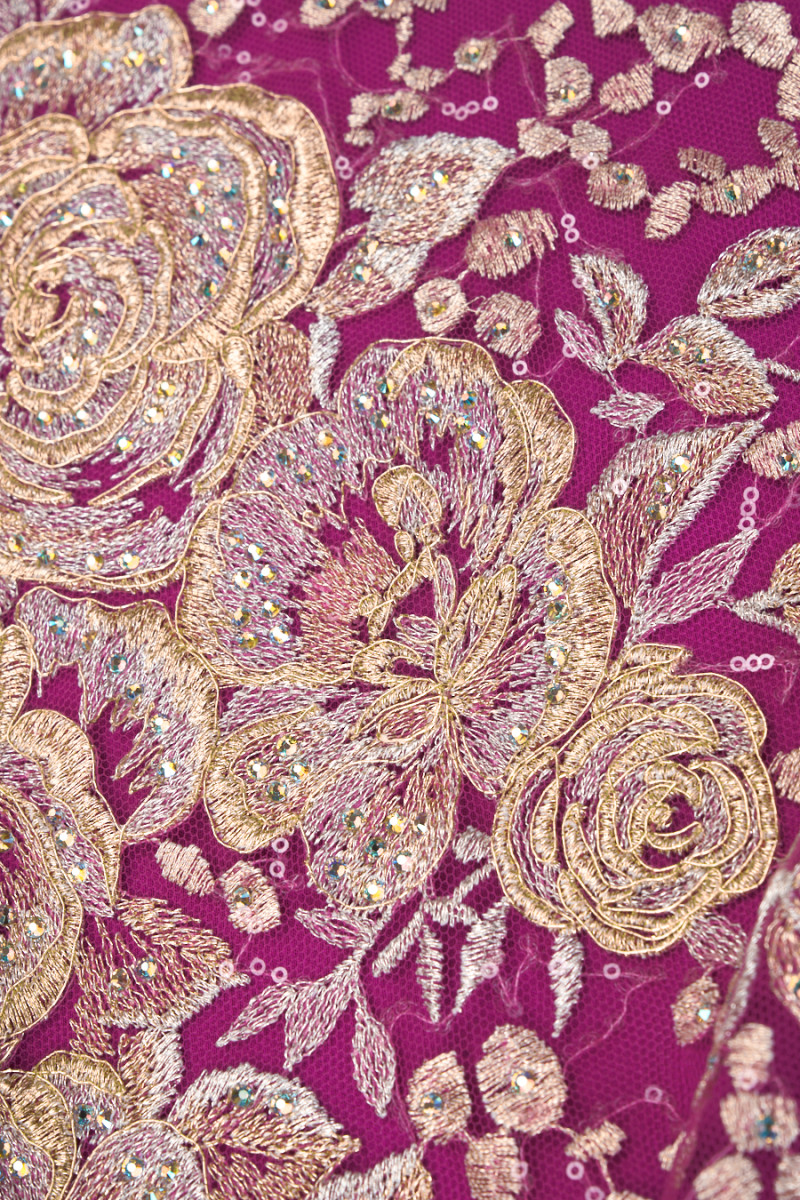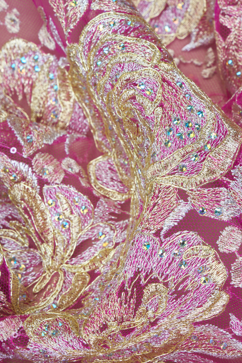 Italienischer steifer Tüll mit klassisch rosa Ösen mit gestickten goldfarbenen Rosen und kleinen goldenen Blättern, reich verziert mit schillernden Steinen und kleinen transparenten Pailletten. Die Stickerei wird zu den beiden Kanten hin dicker, daher empfehlen wir, um den Rand herum zu nähen. Der Stoff ist sehr effektiv, transparent (erfordert Futter), unflexibel und leicht. Die auf dem Stoff platzierten Steine glänzen wunderschön und verleihen dem Stoff ein exklusives Aussehen. Ein fantastischer Vorschlag, um ein Abendkleid, einen Rock oder eine Bluse in einer sehr interessanten Auflage zu nähen. T