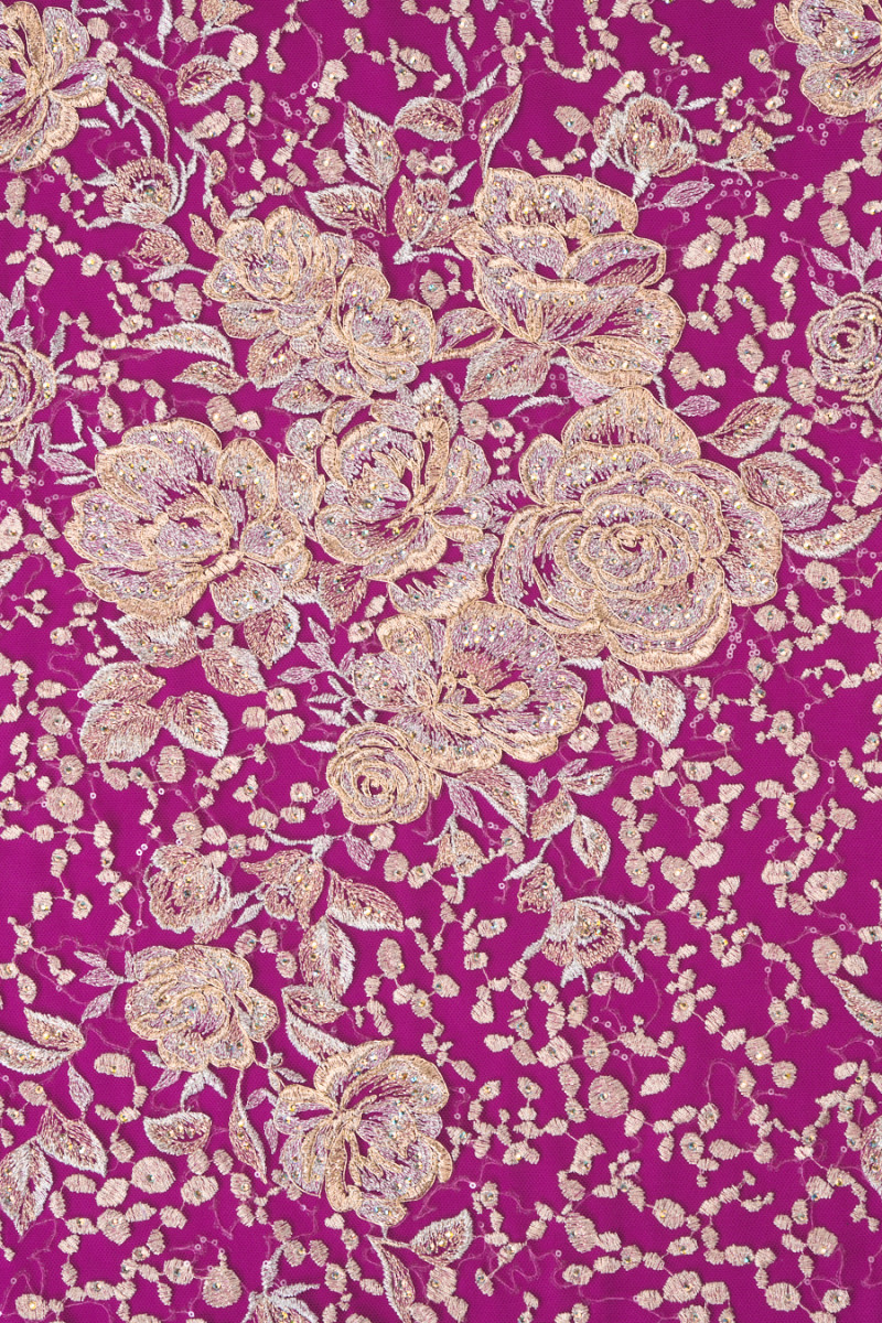 Italienischer steifer Tüll mit klassisch rosa Ösen mit gestickten goldfarbenen Rosen und kleinen goldenen Blättern, reich verziert mit schillernden Steinen und kleinen transparenten Pailletten. Die Stickerei wird zu den beiden Kanten hin dicker, daher empfehlen wir, um den Rand herum zu nähen. Der Stoff ist sehr effektiv, transparent (erfordert Futter), unflexibel und leicht. Die auf dem Stoff platzierten Steine glänzen wunderschön und verleihen dem Stoff ein exklusives Aussehen. Ein fantastischer Vorschlag, um ein Abendkleid, einen Rock oder eine Bluse in einer sehr interessanten Ausgabe zu nähen.