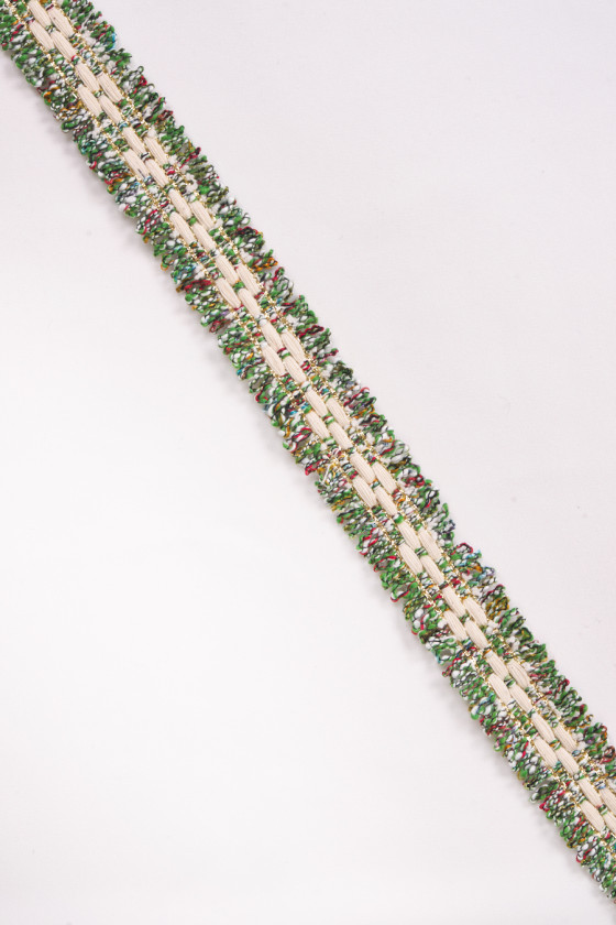 Italienisches Chanelgrünes Kurzwarenband mit einer Breite von 2,5 cm. Das Band ist in den vorherrschenden Farben erhältlich: Grün, Creme, Rot und mit einem goldenen Lurexfaden verziert. Ideal für die Veredelung von Chanel-Stoffen.