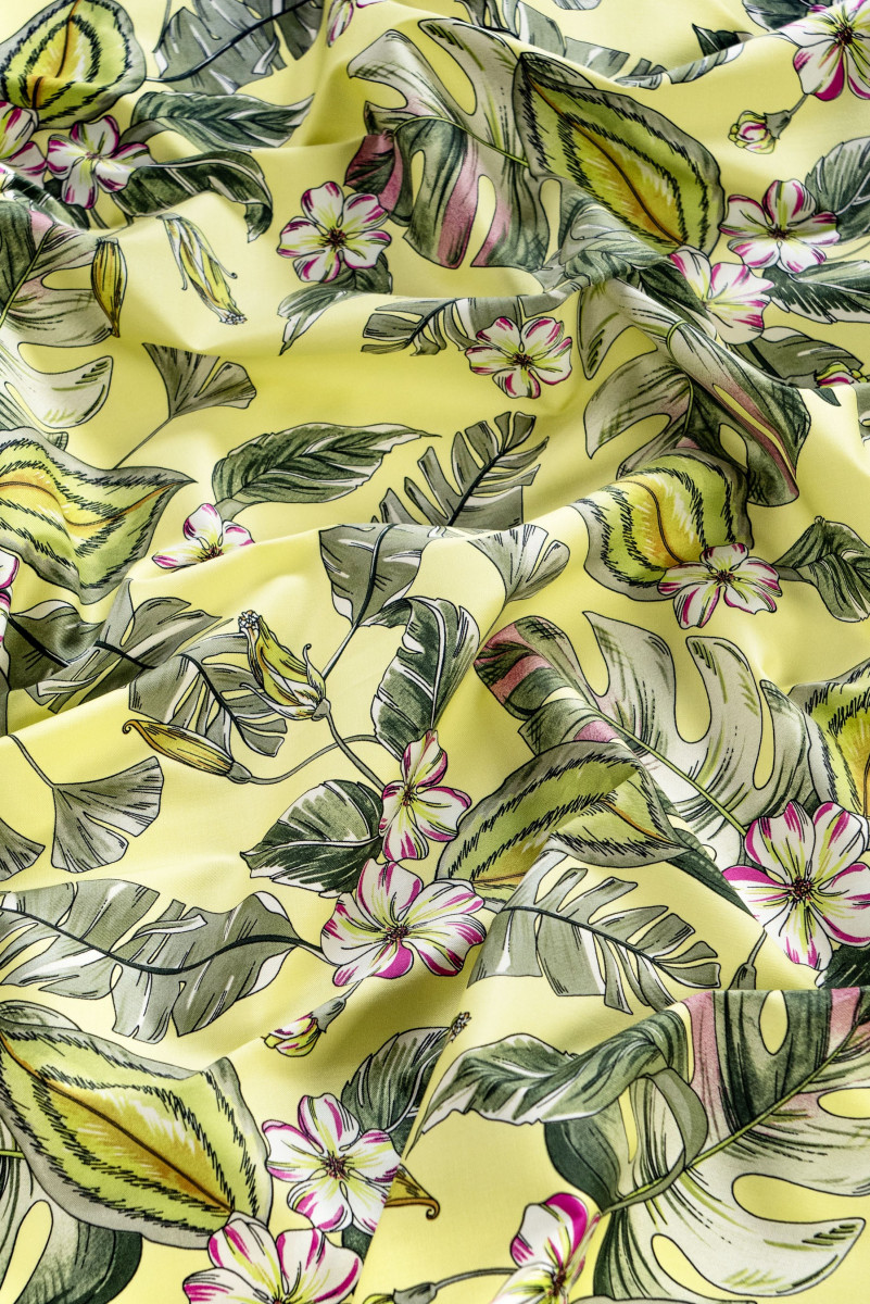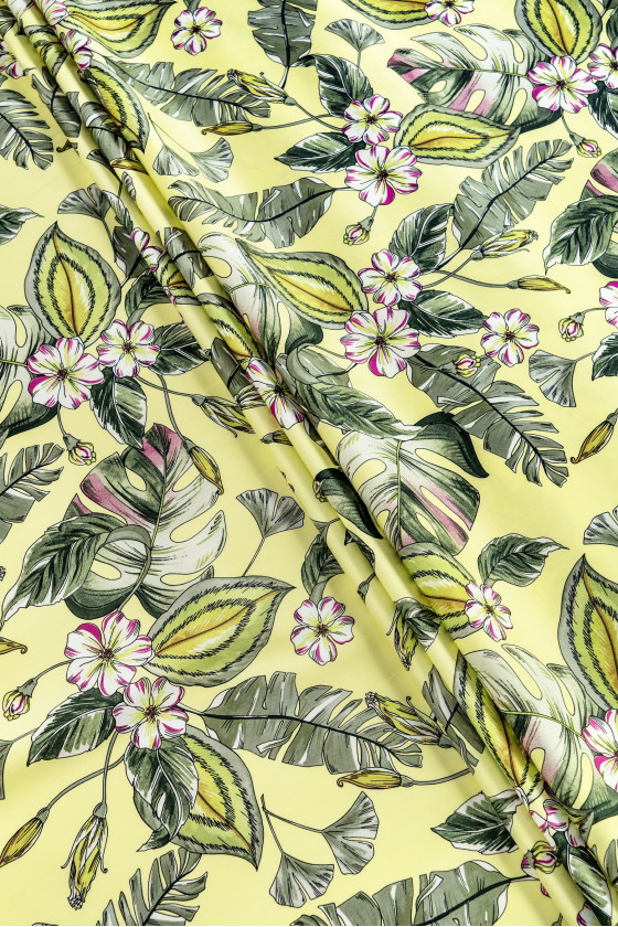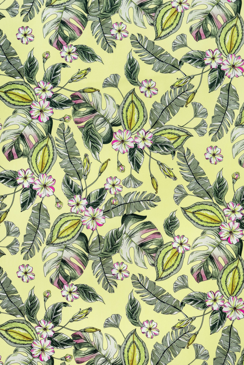 Italienischer Baumwollstoff, elastisch in Zitronenfarbe mit einem Motiv aus exotischen Blättern und Blüten.