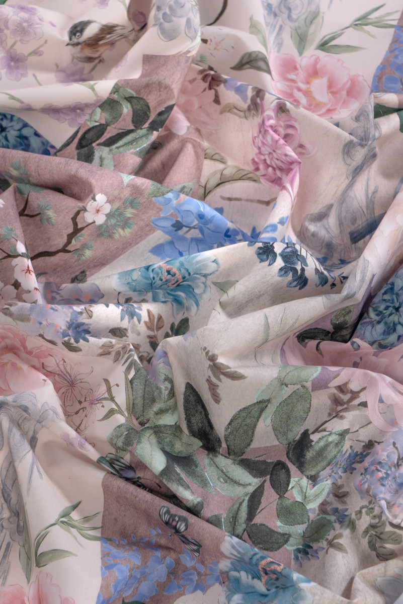 Italienische Hemdbaumwolle mit Patchwork-Effekt mit Motiven von Blumen und Vögeln in Pastellfarben. Der Stoff ist dünn, aber undurchsichtig, leicht elastisch, matt.