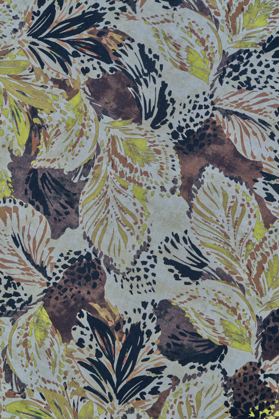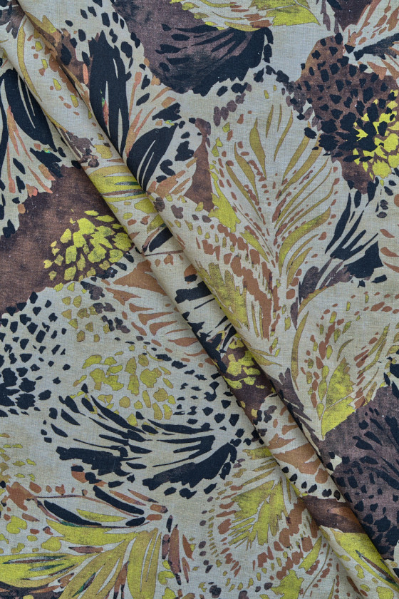 Italienischer Stoff aus 100% Baumwolle mit einem dichten Blattmotiv in Grün und Schwarz auf beigem Hintergrund, zusätzlich gefüllt mit einer dunkelbraunen Farbe. Der Stoff ist dünn, weich, unelastisch und ähnelt in der Webart Leinenstoffen. Ein interessantes Angebot, perfekt für Sommerkleidung - Kleider, Röcke, Hemden oder Shorts.
