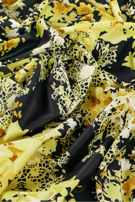 Italienischer Baumwollstoff - schwarz mit gelben Blüten. Elastisches Gewebe, leicht steif.