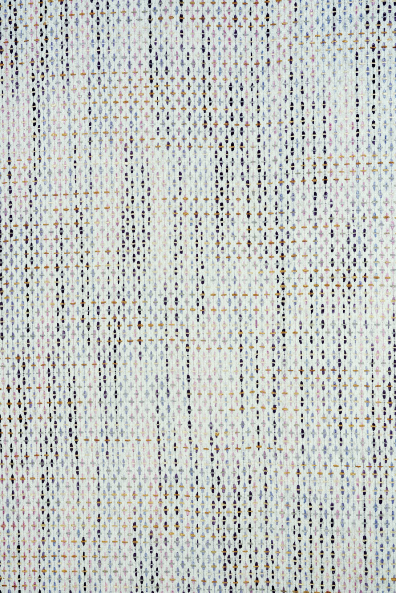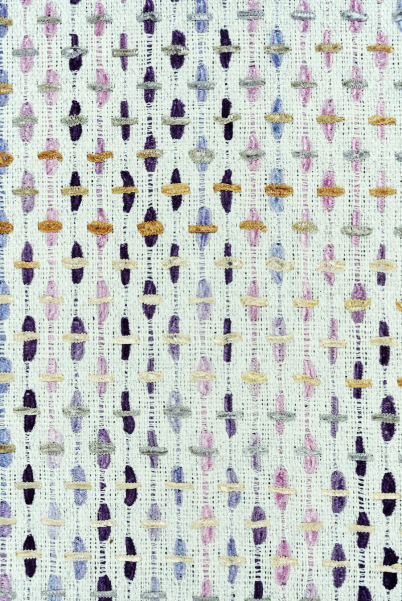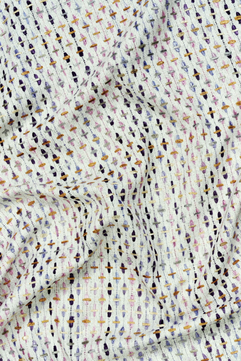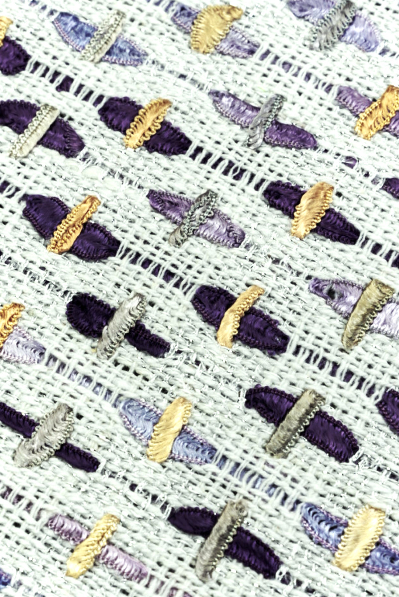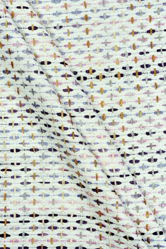 Italienischer Chanel-Kostümstoff aus dichtem Gewebe in der Farbe écru. Es ist mit kleinen Mustern verziert, die Kreuzen ähneln und aus gewebten Satinbändern in den Farben Lila, Rosa und Beige bestehen. Durch die Muster entstehen vertikale Streifen, die die Figur schön verlängern und schlanker machen. In das Material wurde dezent ein silberner, glänzender Faden eingewebt, der ihm Eleganz verleiht. Der Stoff ist unelastisch, mitteldick und angenehm weich. Dank des hohen Anteils an Naturfasern wie Viskose und Baumwolle liegt das Material angenehm in der Hand, was sich auch in einem Tragekomfort niederschlägt. Ein großartiges Angebot für Menschen, die ein interessantes Stoffdesign suchen. Damit lassen sich Kostüme, Jacken, Röcke oder Kleider nähen.