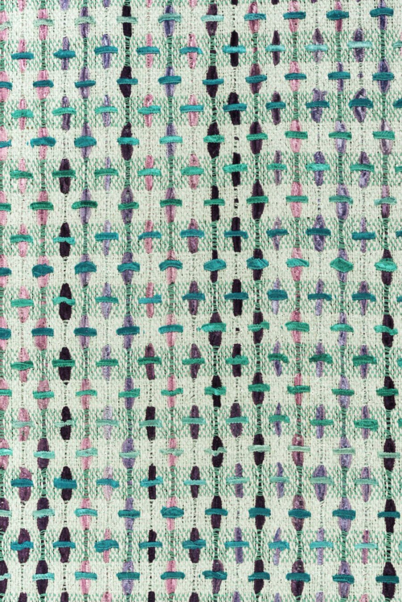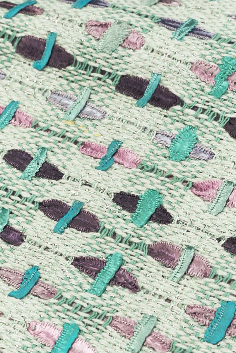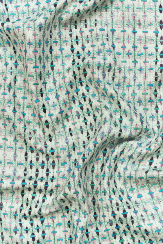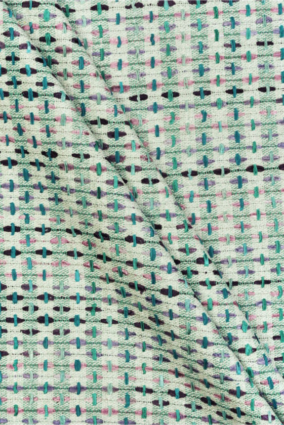 Italienischer Chanel Trachtenstoff mit dichter Webart aus Ecru- und Mintfäden. Es ist mit kleinen Mustern verziert, die Kreuzen ähneln und aus gewebten Satinbändern in den folgenden Farben bestehen: Mint, Türkis, Rosa und Lila. Durch die Muster entstehen vertikale Streifen, die die Figur schön verlängern und schlanker machen. In das Material wurde dezent ein silberner, glänzender Faden eingewebt, der ihm Eleganz verleiht. Der Stoff ist unelastisch, mitteldick und angenehm weich. Dank des hohen Anteils an Naturfasern wie Viskose und Baumwolle liegt das Material angenehm in der Hand, was sich auch in einem Tragekomfort niederschlägt. Ein großartiges Angebot für Menschen, die ein interessantes Stoffdesign suchen. Damit lassen sich Kostüme, Jacken, Röcke oder Kleider nähen.