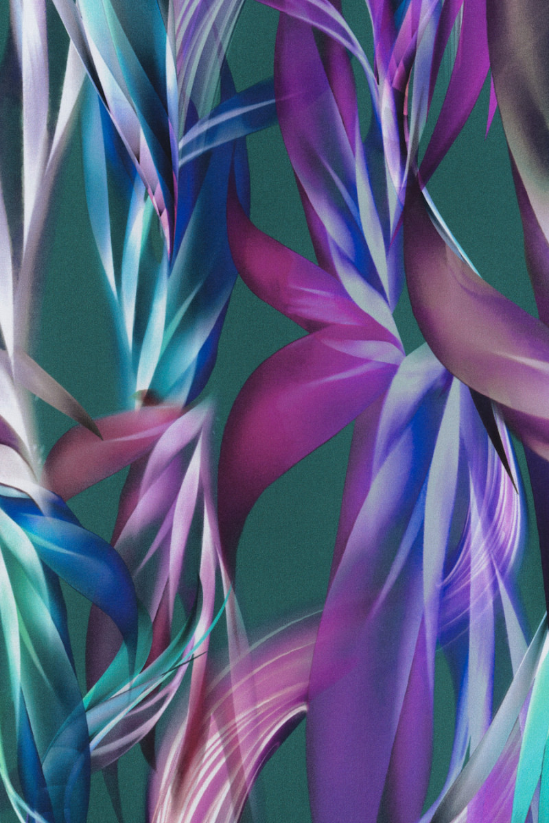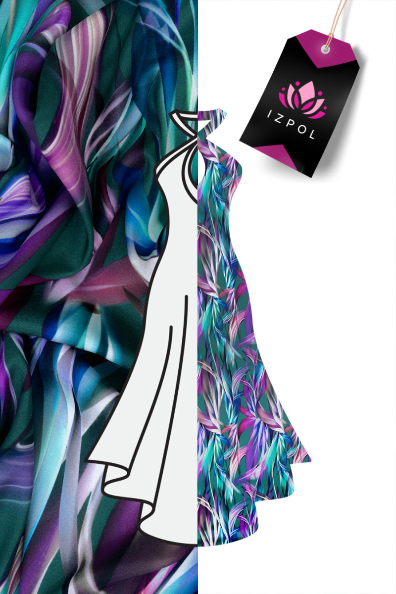 Italienischer Seidensatin, elastisch mit einem Motiv aus länglichen Blättern auf dunkelgrünem Hintergrund. Ein dicht gearbeitetes Muster in den Farben Kornblume, Lila, Fuchsia und Meer verleiht dem Stoff ein schönes Aussehen - der Druck ist auf der matten Seite gemacht.