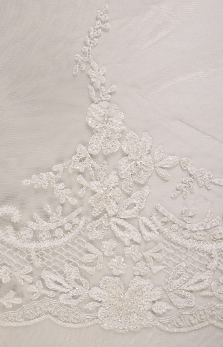 Spitze in Ecru-Farbe, ideal für die Fertigstellung von Hochzeitskreationen oder zum Nähen eines Korsetts, die Höhe des Musters von 12-30 cm. Stoff im letzten Coupon 60*260cm, reich veredelt mit Perlen und Perlen.