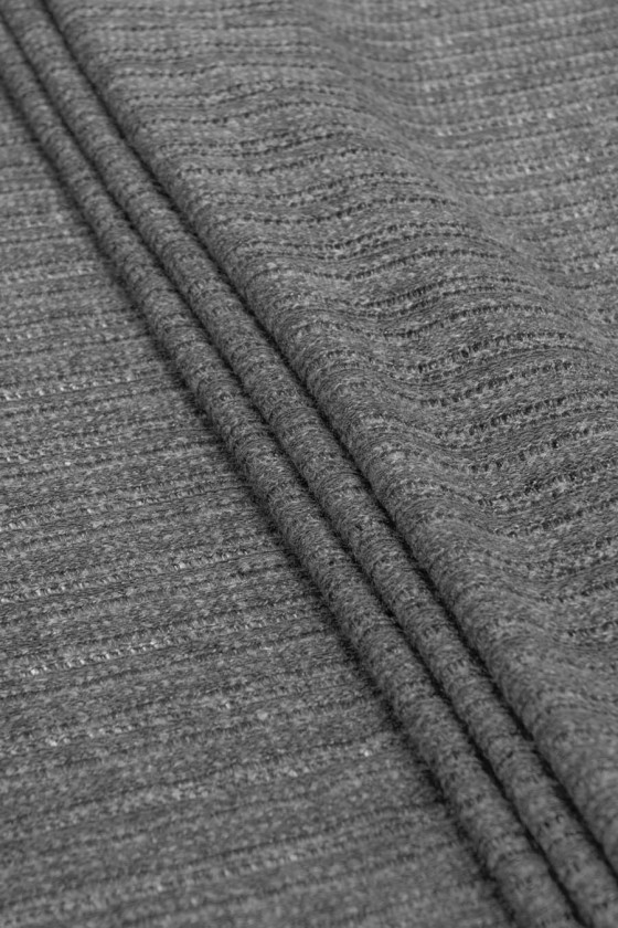 Italienischer Pullover Strickstoff in Grau, gewebt aus natürlicher Wolle mit einer Beimischung von Acryl. Sehr weich und angenehm im Griff mit einem lockeren, durchbrochenen Gewebe. Perfekt zum Nähen eines Pullovers oder eines Winterschals.