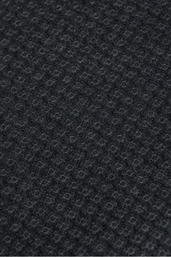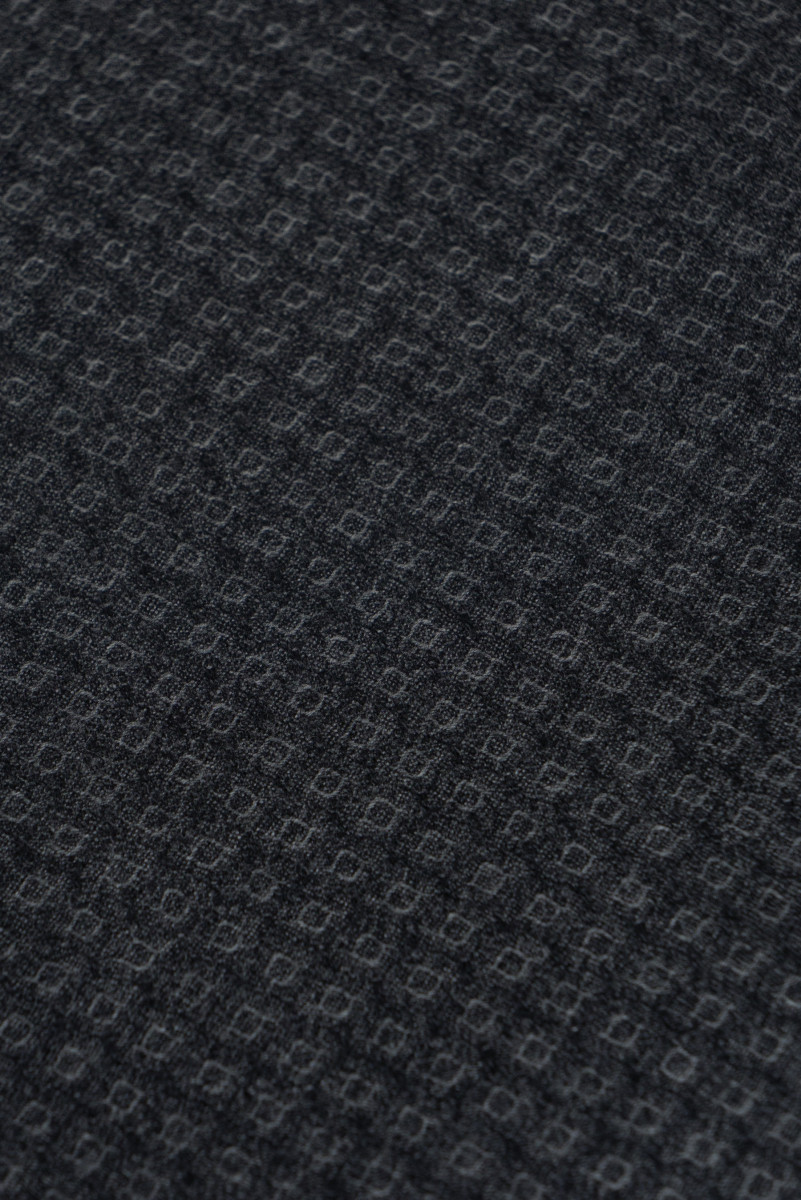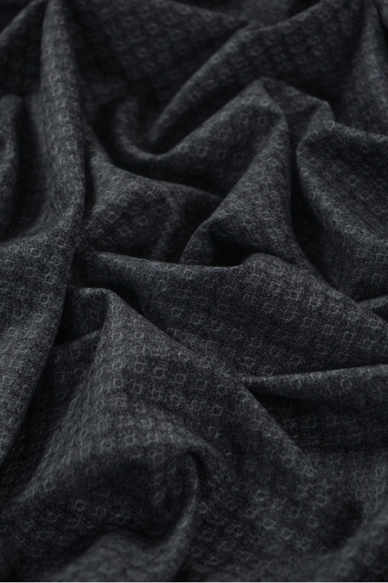 Italienische Kostümwolle in grauer Farbe - doppelseitig. Auf der einen Seite das Motiv der "Schuppen" und auf der anderen Seite das Motiv der Träne und Rauten. Der Stoff ist weich, fleischig, unflexibel von der Herbst-Winter-Art.