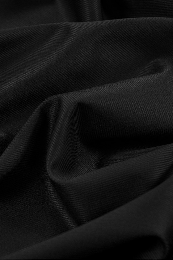 Italienische Kostümwolle in Graphitfarbe mit einem feinen Streifen. Stoff weich, klastische Dicke, unflexibel mit einem leichten Glanz.