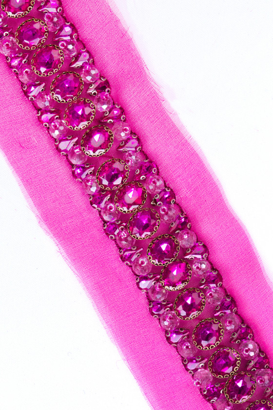 Italienisches Kurzwarenband in einem Coupon mit einer Länge von 50cm und einer Breite von 2,5 cm. Ein schönes Muster aus großen, fuchsiafarbenen Juwelen, eingebettet in Metall in der Farbe von altem Gold, entlang ihnen gibt es kleinere rautenförmige Steine in der Farbe von Fuchsia und runde, hellrosa Steine, die mit einer kleinen Perle abgeschlossen sind. Das Ganze ist auf fuchsiafarbenem Polyesterchiffon genäht. Ein sehr eleganter Vorschlag, um ein Kleid oder eine Bluse zu dekorieren. Wenn Sie 1m Klebeband benötigen, bestellen Sie 2 Gutscheine.
