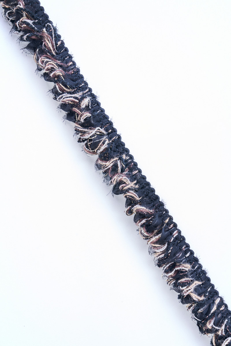 Italienisches Chanel-Kurzwarenband mit einer Breite von 3 cm. Eine sehr interessante Kombination aus schwarzem Polyester-Chiffon und Wollfäden in schwarzem, braunem, cremefarbenem und goldenem Lurex-Faden. Das Ganze ist auf einer Seite vernäht und erzeugt einen schönen Rüschen. Das Tape wird als Finish für Chanel-Stoffe fantastisch aussehen.