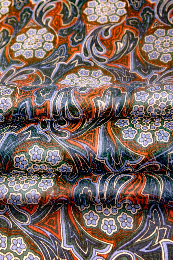 Kresed Seidenchiffon in blau-rot-grüner Farbe mit Ecru in kleinen Blüten, umgeben von einem unregelmäßigen ethnischen Muster. Leichte, luftige, filigrane Naturmaterialfabrik in einem vertikalen Hub zerkleinert. Stoff geeignet für Kleider, Röcke, Blusen, Pareo. Dieser Chiffon erfordert Futter oder starke Falten.