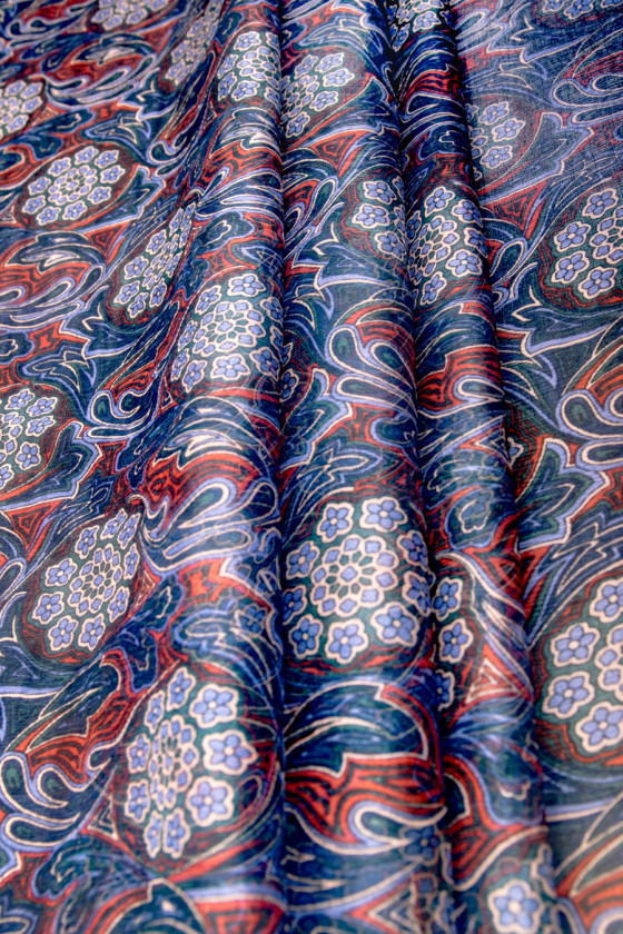 Kresed Seidenchiffon in blau-rot-grüner Farbe mit Ecru in kleinen Blüten, umgeben von einem unregelmäßigen ethnischen Muster. Leichte, luftige, filigrane Naturmaterialfabrik in einem vertikalen Hub zerkleinert.
