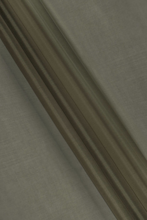 Italienischer Stoff 100% Seide Organza Typ in Khaki Farbe. Organza aus Naturseide ist ein dünner, transparenter, aber steifer Stoff mit einem zarten Glanz, der für Seidenstoffe charakteristisch ist.