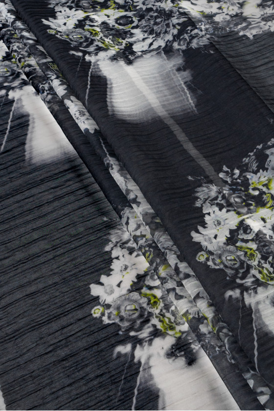 Italienischer Organzastoff aus 100% Seide in einem Coupon mit den Maßen 135 cm* 140 cm. Schöne zwei große Blumenmotive auf grauem, leicht zerknittertem Hintergrund.