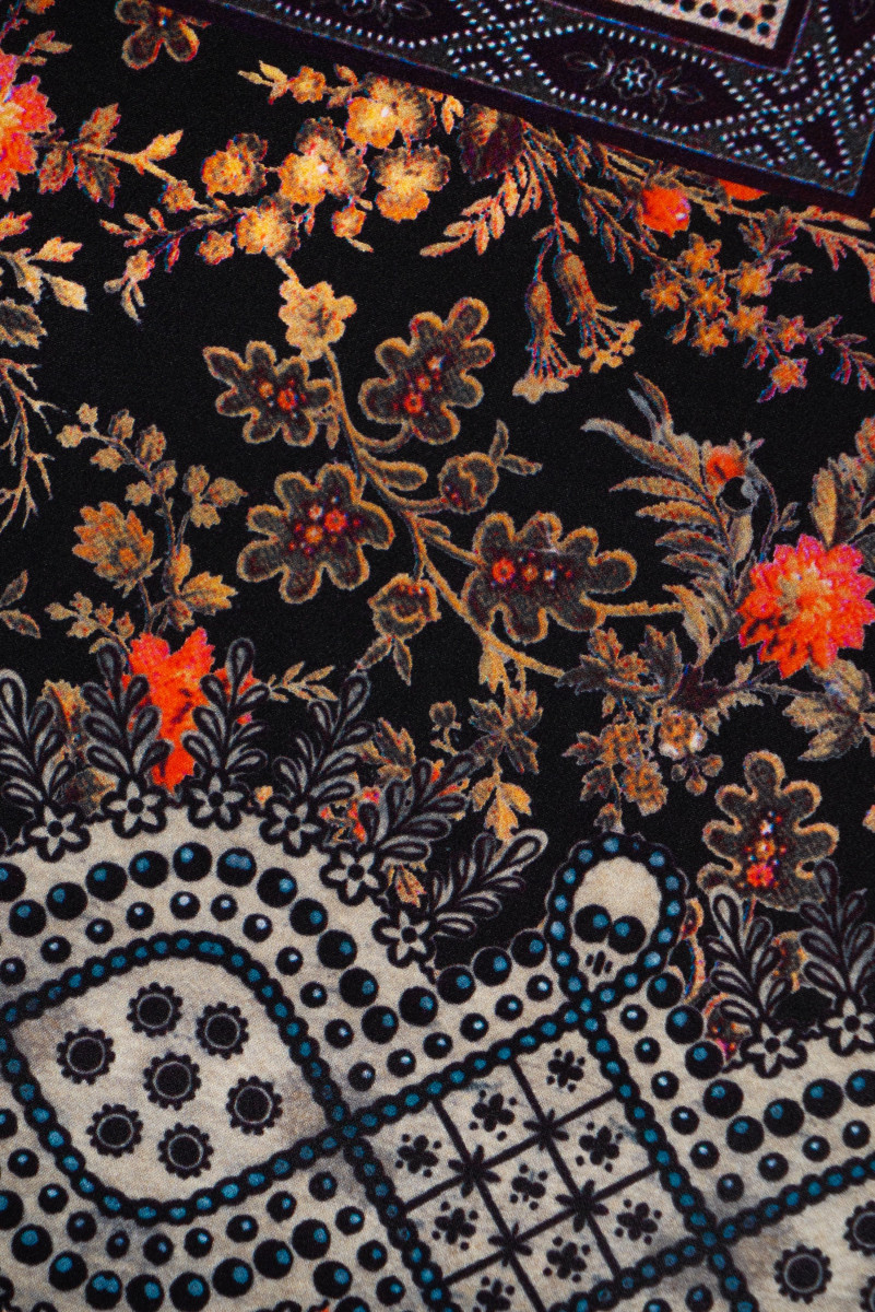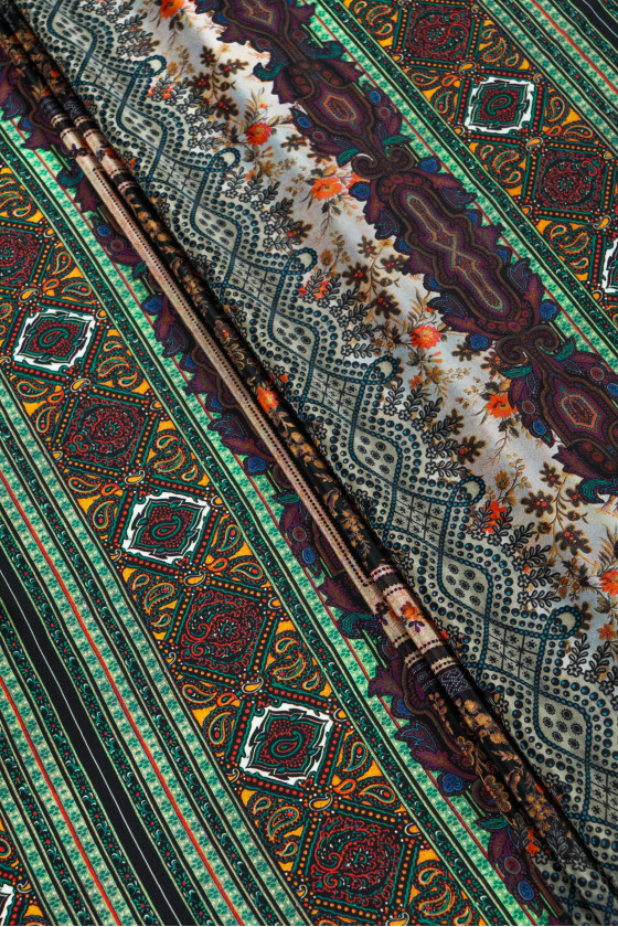 Italienischer Crêpe aus 100% Seide in einem Coupon mit den Maßen 135 cm* 140 cm. Eine interessante Kombination aus floralen und orientalischen Motiven in Herbstfarben.