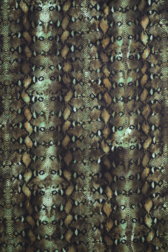 Italienischer Stoff aus 100% Seidentwill mit Schlangenledermotiv. Das Ganze ist in den Farben Beige, Braun, Schwarz, Oliv und Grün gehalten. Der Stoff ist dünn, aber blickdicht mit einer leichten Köperbindung, perfekt zum Nähen eines Hemdes, Kleides oder Schals. Ein fantastisches Angebot für Fans von Tiermustern in gedämpften Farben.