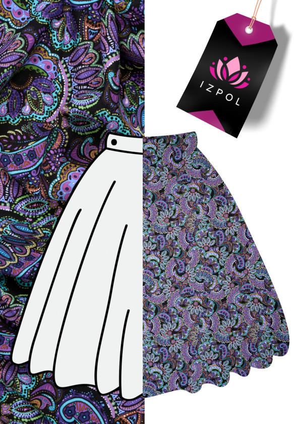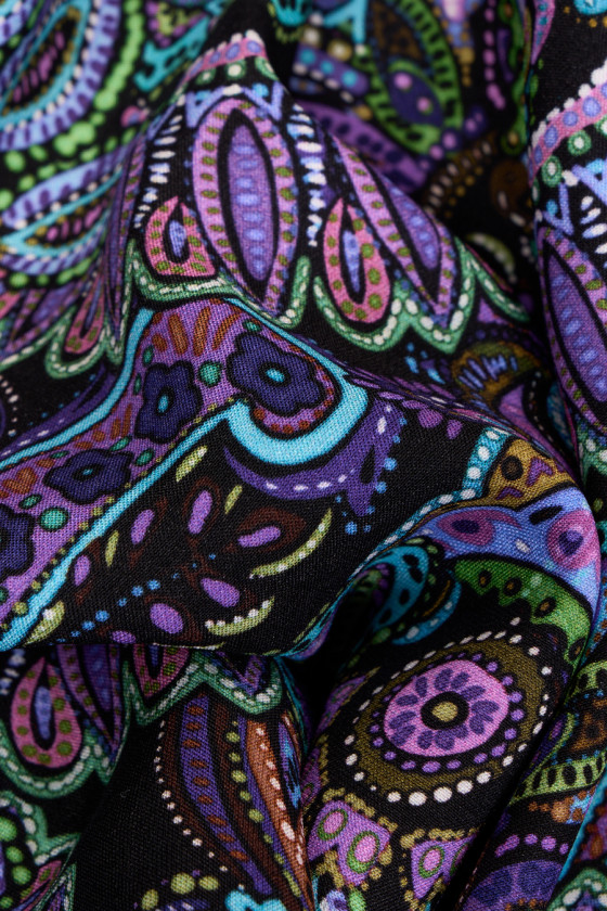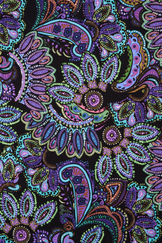 Italienischer Seidensatin mit Elasthan mit dichtem Paisley-Muster in Lila-, Grün- und Blautönen auf schwarzem Hintergrund. Der Stoff ist weich, elastisch und fällt wunderschön mit dem Druck auf der matten Seite. Ein fantastisches Angebot für Menschen, die orientalische Motive in kräftigen Farben mögen. Dieser Stoff eignet sich perfekt zum Nähen eines Kleides, Rocks oder eines schönen Hemdes.