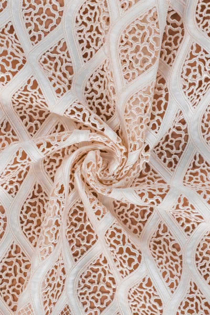Italienische Guipure-Spitze in Ecru-Farbe mit Satineinsätzen in Cremefarbe. Ein sehr interessantes Motiv von Wellen voller Blumen. Krone auf beiden Seiten mit einem Zahn (asymmetrisch) veredelt - das Muster tritt peripher auf. Beachten Sie, dass die Spitze 58 cm breit ist.