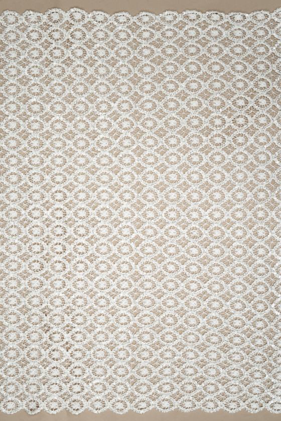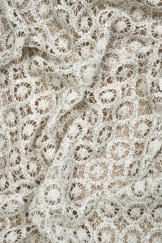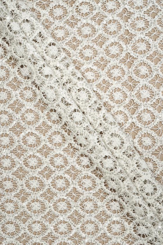 Italienische Spitze mit durchbrochenem Muster in cremefarbener Farbe, verziert mit Silberperlen und transparenten Pailletten. Der Stoff ist weich, transparent, unelastisch und hat dank der verwendeten Perlen einen zarten Glanz. Fantastische Spitze, die vielseitig einsetzbar ist, kann zum Zaubern von Kleidern, Blusen, Röcken, Oberteilen und auch für Veredelungen verwendet werden.