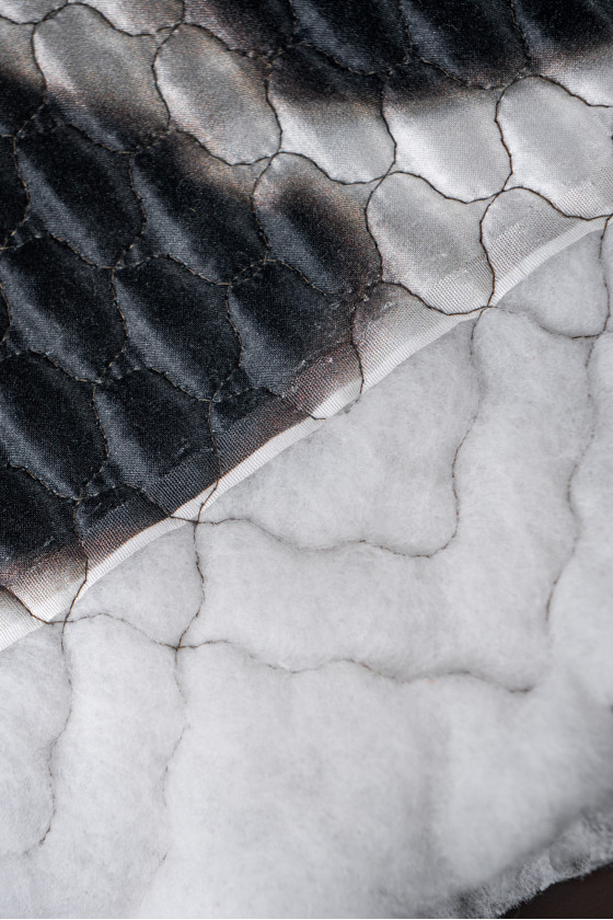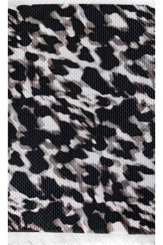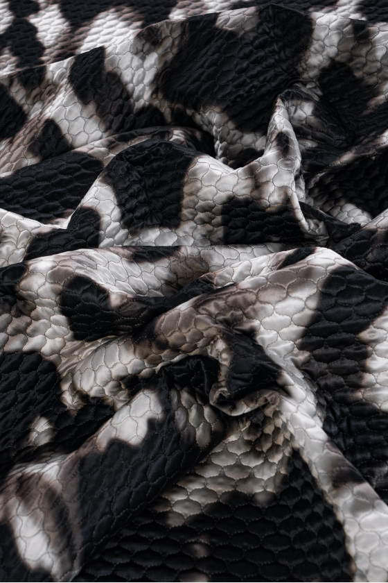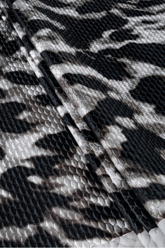 Der Leisten coupon einem interessanten, doppelseitig gesteppten Stoff. Auf der einen Seite mit einem Muster aus großen, dunkelbraunen Flecken auf weißem Grund, auf der anderen Seite ohne Muster in Grau und Stein.