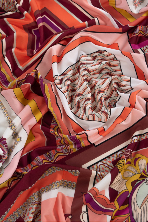 Italienischer Polyester-Strick mit Patchwork-Motiv mit Blumen und geometrischen Elementen. Strick dünn, aber deckend, matt, sehr elastisch - ideal zum Nähen eines Sommerkleides, einer Bluse, eines Rocks oder einer Parea.