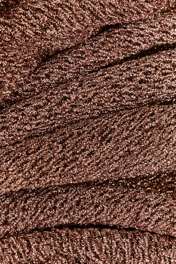 Italienischer Polyester-Strickstoff in dunkelgoldener Farbe mit einem Lurexfaden in Georgette-Bindung. Leicht elastisch, blickdicht, sehr effektiv, Goldfaden erzeugt eine leicht konvexe Struktur. Ein perfektes Angebot für Blusen, Kleider, Röcke mit aufgeschlossenem und inszeniertem Charakter.